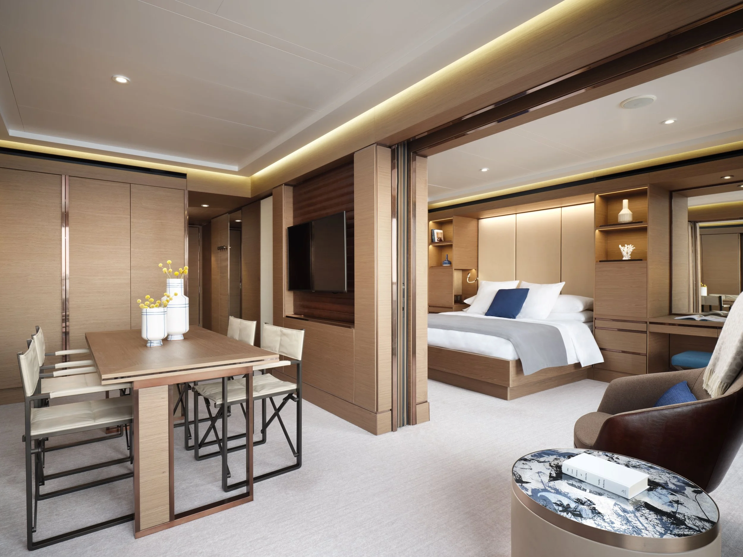 The Terrace Suite Convertible Bedroom and Dining Room / The Ritz-Carlton Yacht Collection. / @ Jack Hardy.